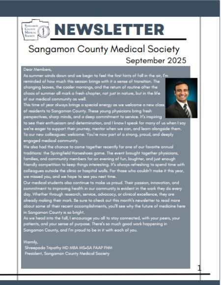 If you have an email address, and would like to receive updates and action alerts from the Sangamon County Medical Society, please let us know. More and more of our communications is sent electronically. You can get newsletters faster and eliminate paper clutter on your desk. Don't worry, we won't inundate your inbox!